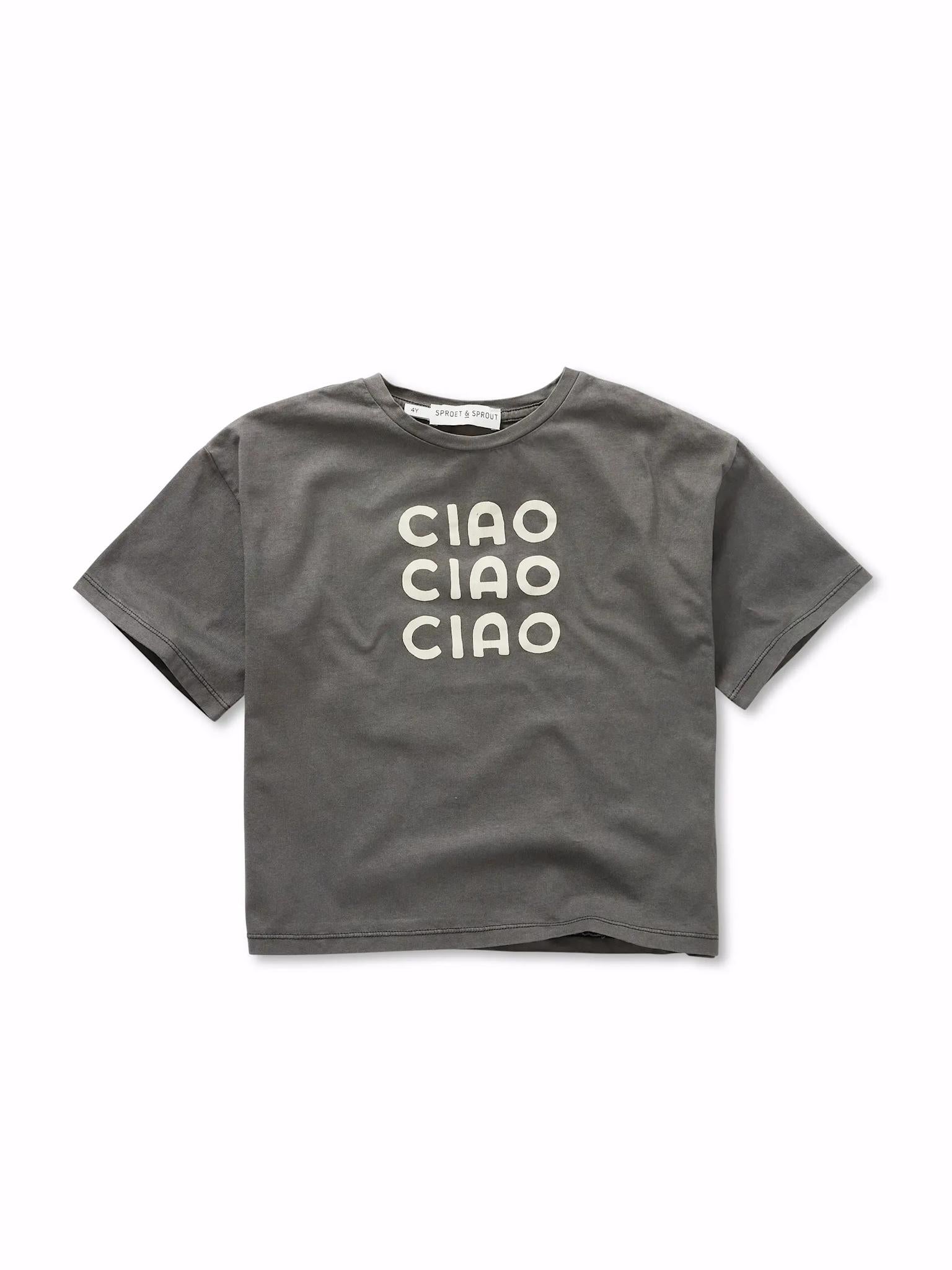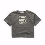 Say it three times and spread the vibe: Ciao, Ciao, Ciao. This washed black T-shirt brings a laid-back coolness to every day. Made from 100% organic cotton, it’s soft, breathable, and built for play. Available in sizes 3M-12Y. For easy dressing, this T-shirt has press buttons on the left shoulder up to size 2 years. Team longer or team cropped? This one’s the regular fit — for the cropped girls’ tee, pick S26-2134.