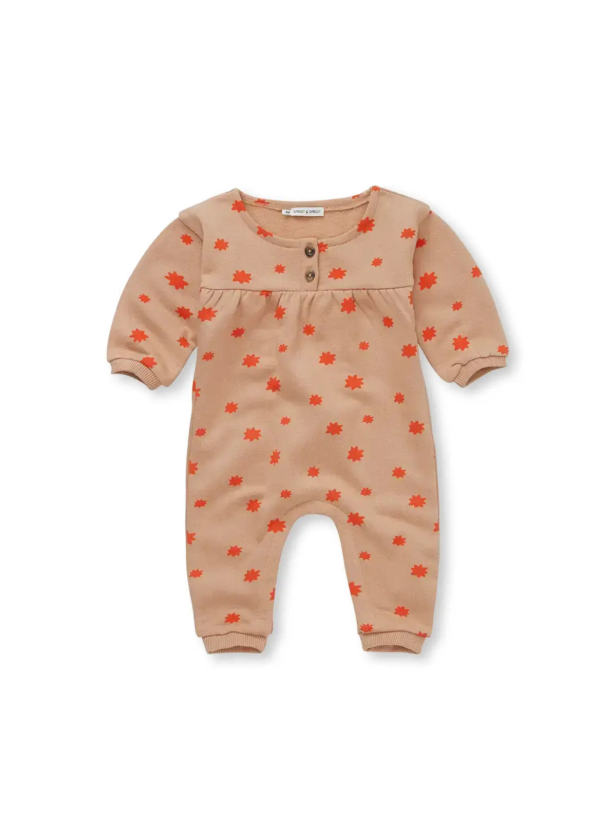 A soft autumn favourite. The praline baby onesie is scattered with a bright stardust print in red and finished with wooden buttons and gathered yoke detail. Made from brushed organic cotton for extra warmth.