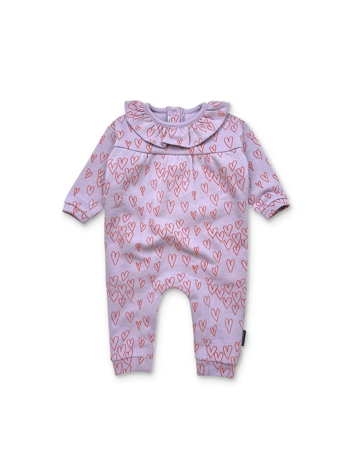 Love at first sight: the baby onesie in lavender is covered in cheerful red hearts and made from brushed organic cotton. With a ruffled collar and balloon sleeves, this onesie is both adorable and practical.