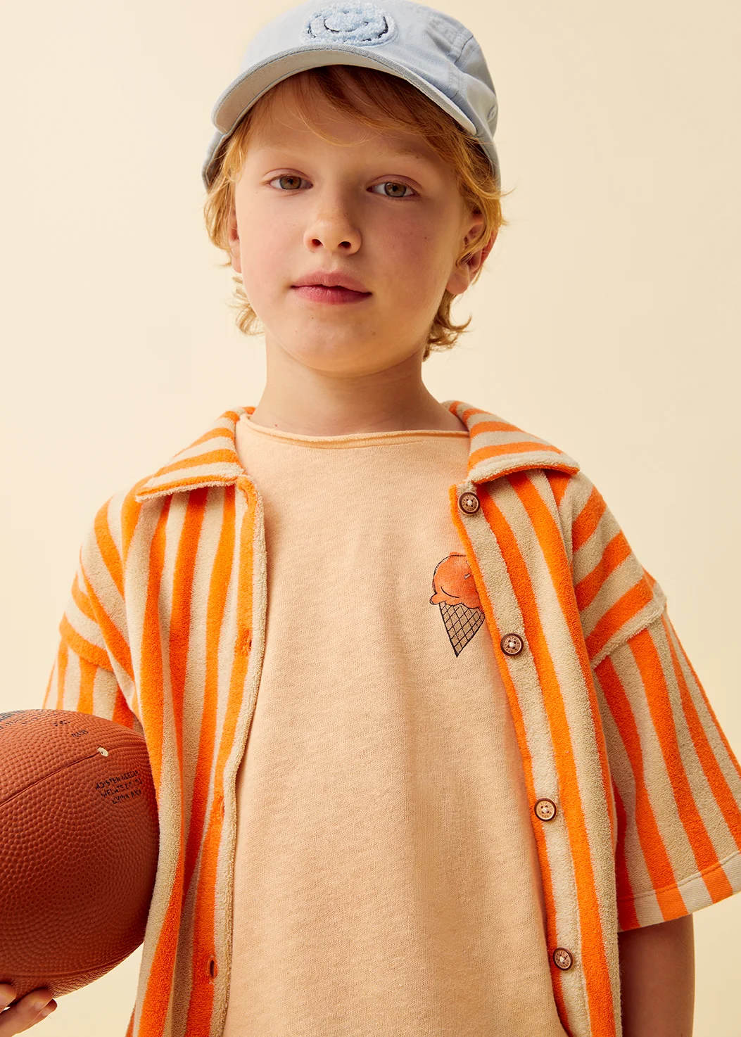 For kids who chase both sandcastles and sweet victories. This sand-coloured linen mix T-shirt is simple yet full of charm, finished with a fun printed ice cream cone on the chest. Crafted from a 70% organic cotton and 30% linen blend, it feels airy and soft against the skin. Available in sizes 3M-12Y. For easy dressing, this T-shirt has press buttons on the left shoulder up to size 2 years.