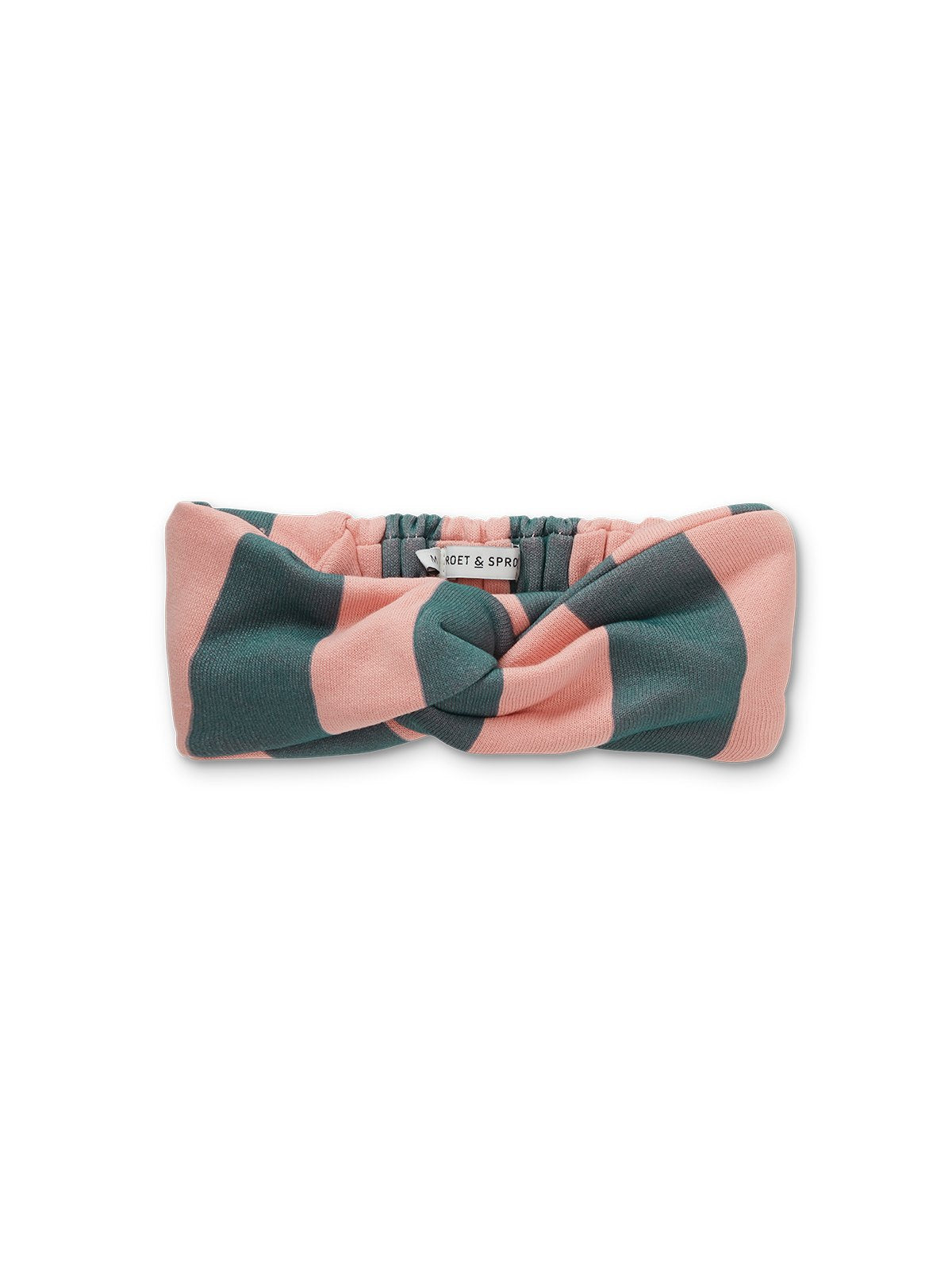 Weiches Haarband in Pfirsichparfait und schattigen grünen Streifen. Aus Bio-Baumwolle gefertigt, mit bequemem Gummizug hinten und verspieltem Twist-Detail vorne.