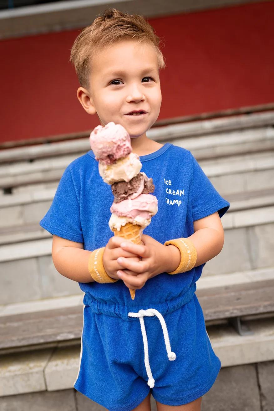 Ready, set, play! This sporty terry jumpsuit in bold blue brings comfort and energy to every game. Featuring the fun “Ice Cream Champ” detail, it’s crafted from 100% organic cotton—soft, breathable, and built for adventure.