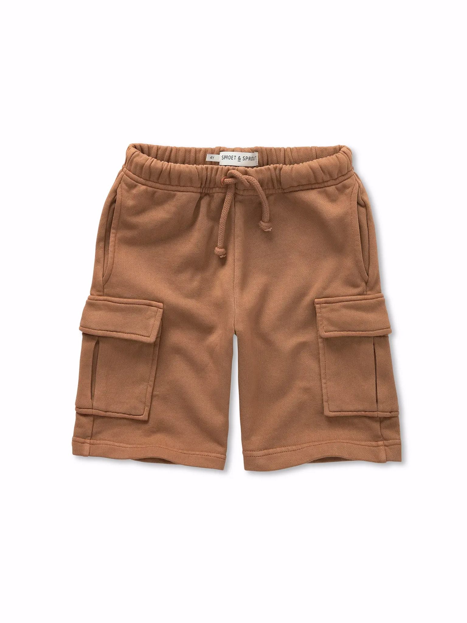 Adventure-ready. These tobacco-toned cargo sweatshorts come with pockets big enough to carry treasures from the day’s explorations. Designed for comfort in 100% organic cotton, with a look that’s both practical and playful.