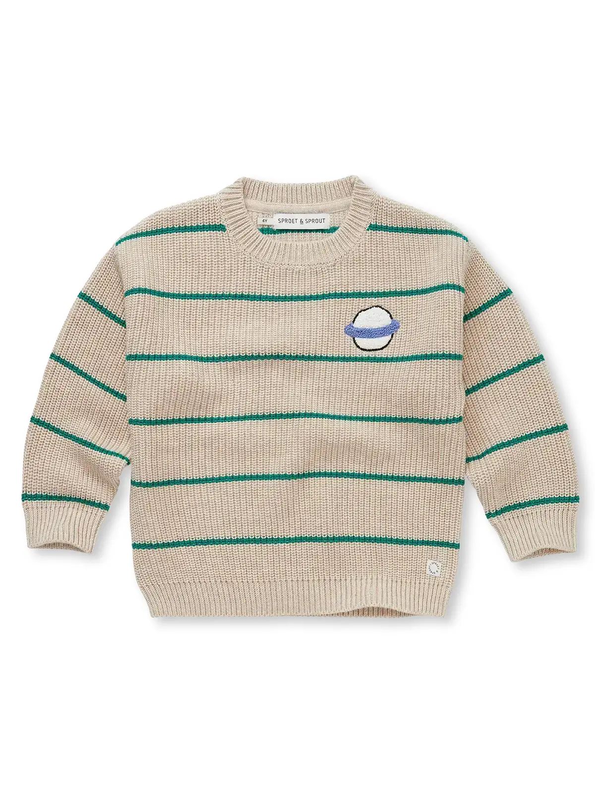 Ce pull 100 % coton ivoire à fines rayures vertes arbore un motif « Saturne » en éponge sur la poitrine pour une touche ludique. Il s'accorde parfaitement avec le pantalon de jogging vert Sproët pour un look coordonné et tendance.