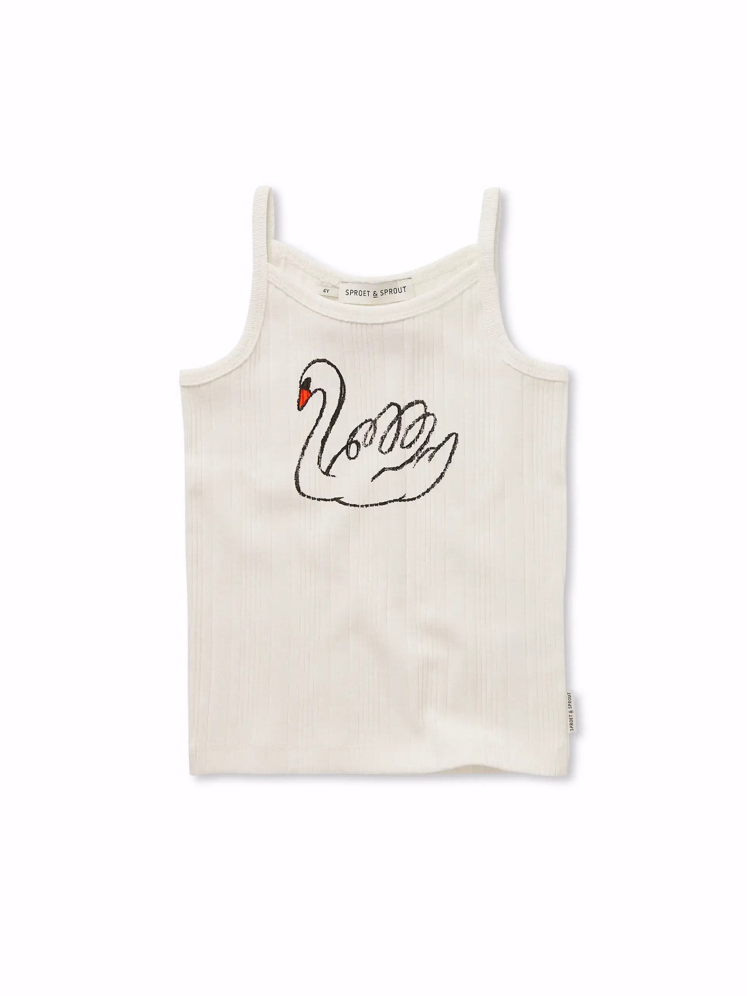 A swan to keep close this summer. This off-white spaghetti top is lightweight and playful, designed for warm days and carefree fun. Made from 100% organic cotton, sizes 3M–12Y.
