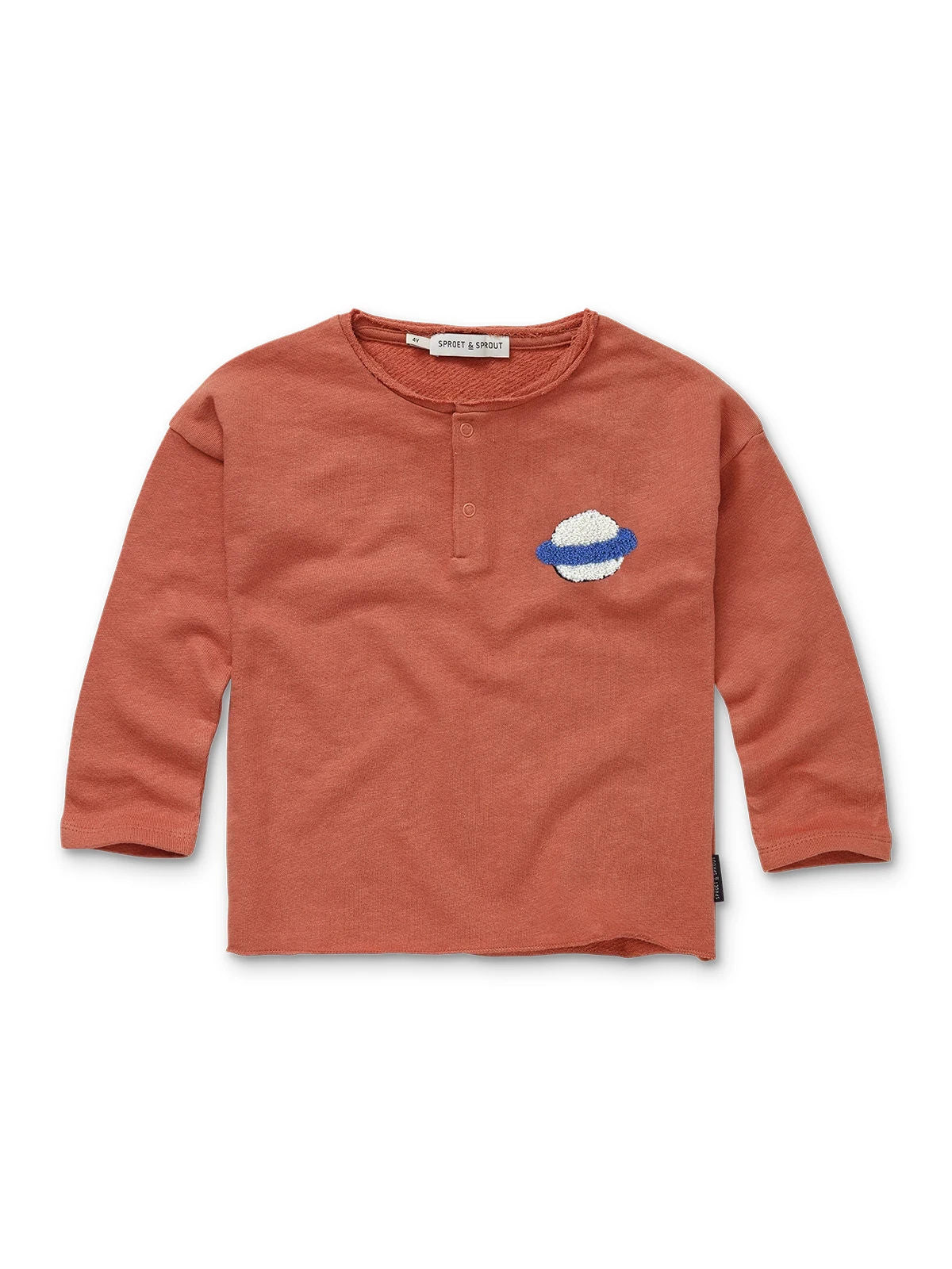 Découvrez notre t-shirt manches longues en molleton léger pour garçon, couleur brique, 100 % coton biologique. Confectionné dans un tissu doux et structuré, il présente une encolure mao et un discret imprimé « Saturne » sur la poitrine. Idéal pour des aventures insouciantes et des heures de jeu.