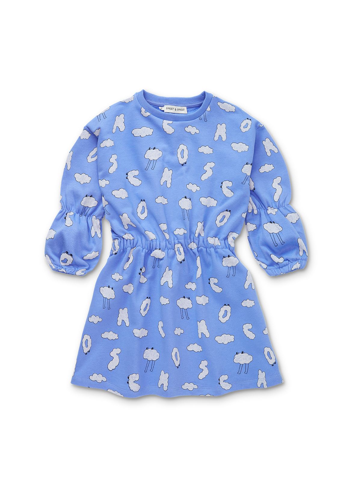 This cheerful dress in vibrant Ultramarine is made from soft, brushed organic cotton sweat. With elastic at the waist and cuffs for a playful silhouette, and a dreamy all-over Cloudman print that invites imagination. A colourful favourite for everyday wonder. This dress is available in sizes 12 months to 12 years.