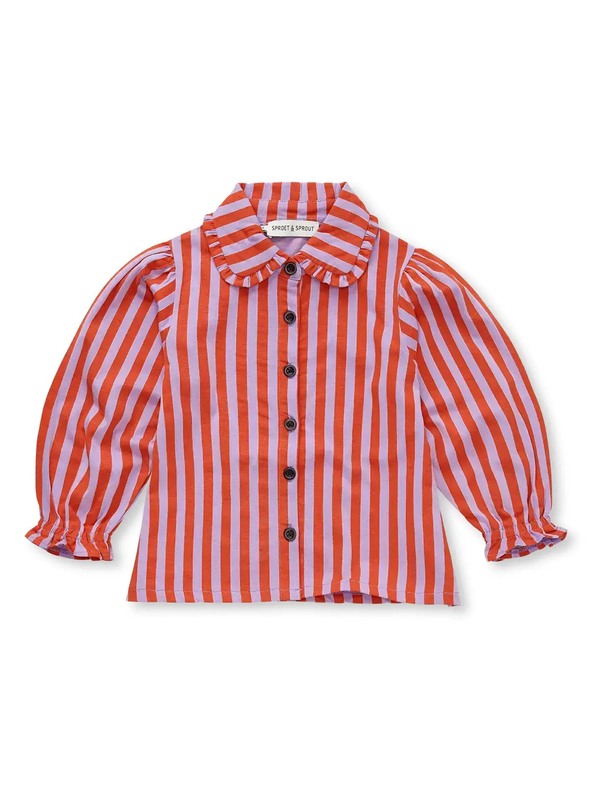 Looking for a stylish blouse but with the comfort of a T-shirt, then this loose fit blouse made from soft jersey in 100% organic cotton is your choice. Finished with a stylish Peter Pan collar with ruffles along the edge, red-lavender stripes print and slightly puffed long sleeves. Combine this top with our black denim skirt to steal the show. This top is available in sizes 12 months to 12 years.