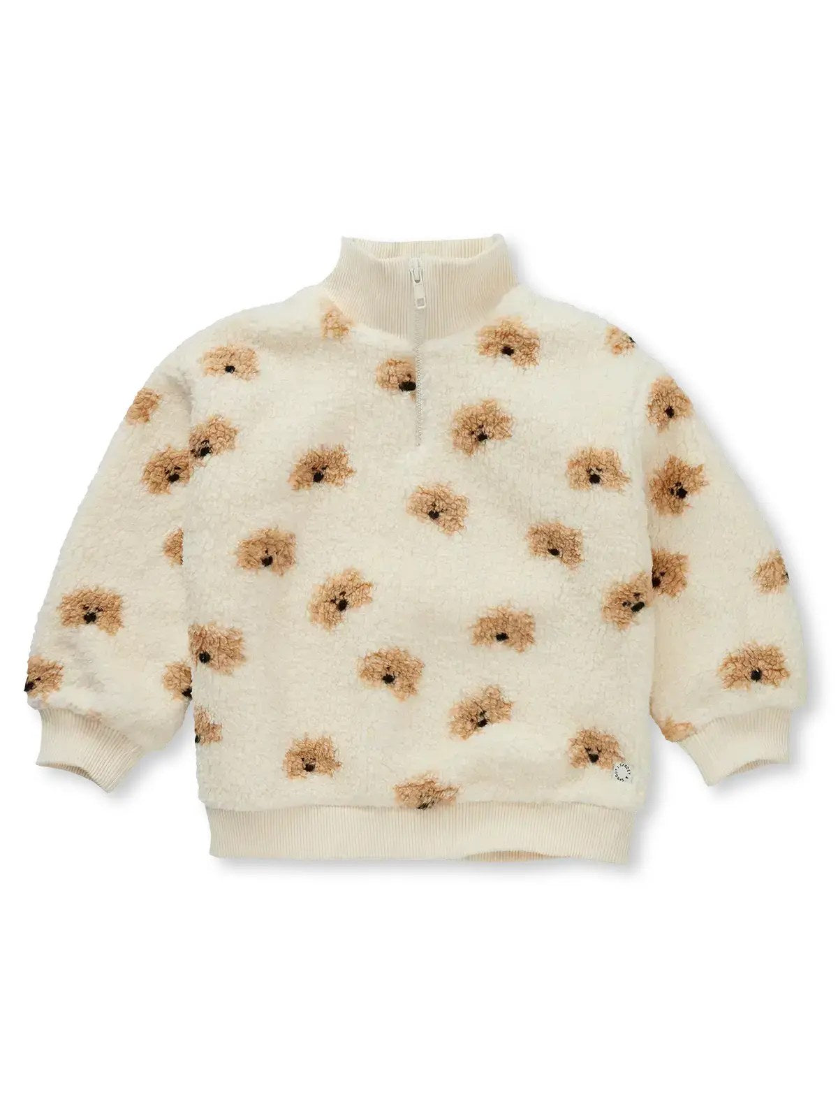 A playful twist on our classic teddy mock-zip sweatshirt — this ivory version features an all-over moustache dog print, created in collaboration with Gisele et Rose. Soft, cosy, and a truly unique eye-catcher. Available in both baby and kids’ sizes, ranging from 12 months to 12 years.